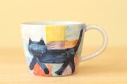 瀬戸の磁器土に、カラフルにチェックを絵付けした中にくろねこのシルエットを歩かせました。