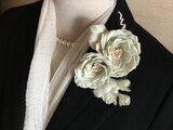 淡い緑にグレーが少し混ざった微妙な色目のコサージュです。鈴蘭風な花のがくに糸抜きをした布を付けました。花にボリュームがあります。
