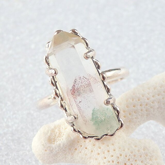 グリーンとレッドの山が入りこんだファントムクォーツを粒飾りのリングに仕上げました。