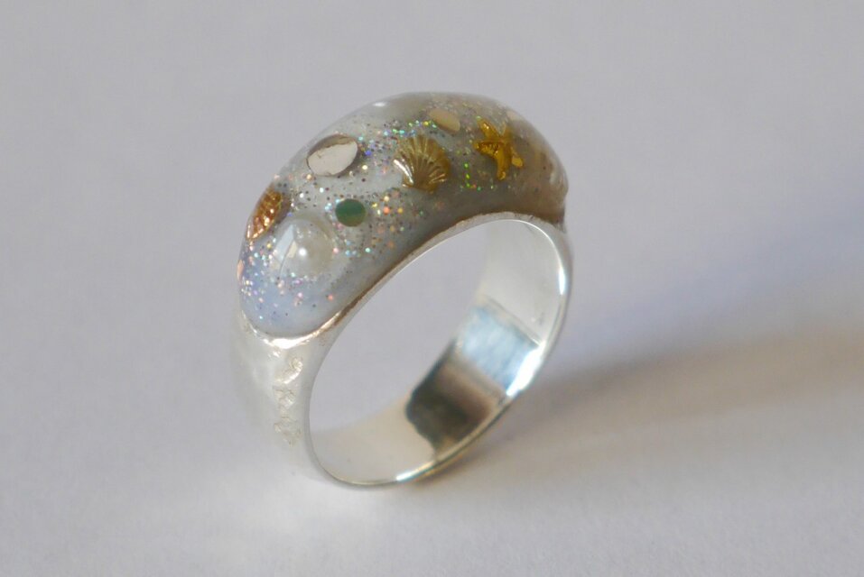 リングの表面は、槌目のテクスチャをつけて、中央部分だけ樹脂加工しています。