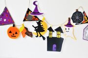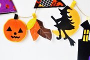 毎年大人気のハロウィンガーランドに今年初のモチーフ・シルエット魔女とクモの巣や棺桶等を付け