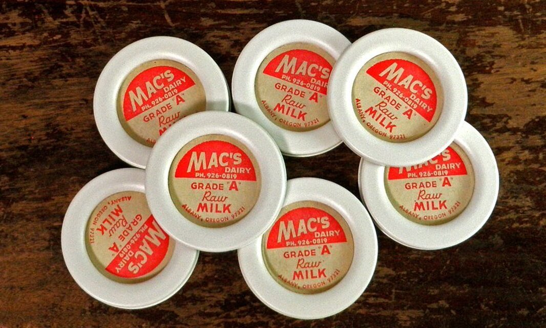 カバー付きの立体的なヴィンテージミルクキャップ7個セット。プラスチック製の白いカバーフレームに、紙製のミルクキャップがきっちりとはめこまれた作り。