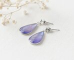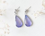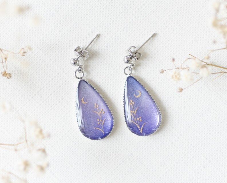 三日月と三つ葉を描いた絵を、樹脂で閉じ込めたピアスです。