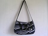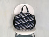 レトロ・フューチャーな雰囲気の変わりストライプ柄コットン生地を使った、たっぷり荷物が入る、ちょっと大きめのトートバッグです。肩にかけたり、斜めがけにしても使えるよう、ショルダー紐もつけて2way仕様にしました。
