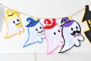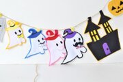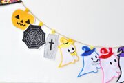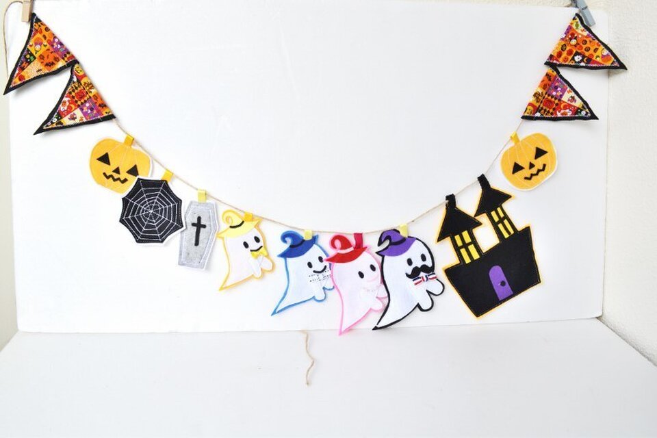 お化け一家の楽しいいハロウィンガーランドです。フェルト、シールフェルト、ハロウィンプリン生地を使用して作ったカラフルでカワイイ~モチーフが沢山付いたガーランドになっています♪