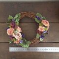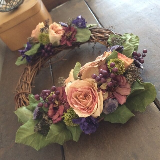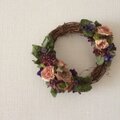 ドライフラワーの薔薇や小花を使ってリースにしあげました。
