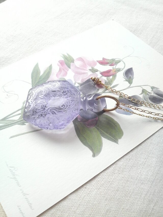 透けるような淡いパープルにうっとりしてしまうヴィンテージ香水瓶でおつくりしましたネックレスです。