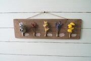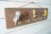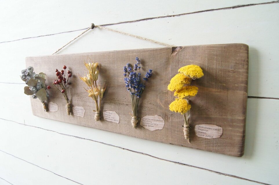 エイジング加工した古びた味のある板に自家製ドライフラワーを標本風に貼り付けました。