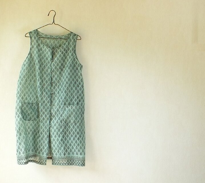 木版印度更紗の生地を使って、ノースリーブの前開きワンピースを作りました。