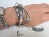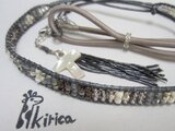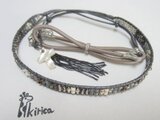 ガンメタリックグレーの革紐に、丸大ビーズをキラキラ並べて