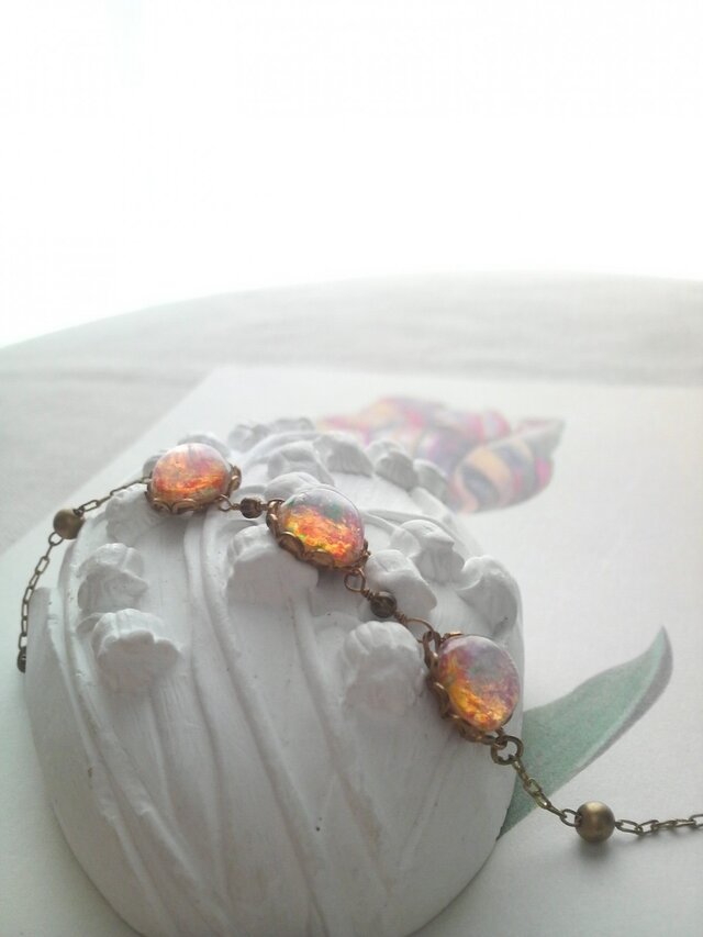 チェコスロバキア製、ヴィンテージグラスカボション、Pinkファイヤーオパール約φ9ミリでお作りしましたブレスレットです。