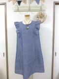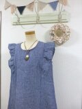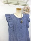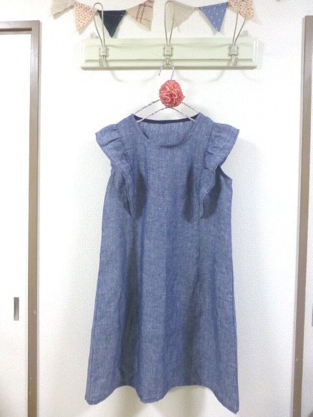 紺色のシャンブレーリネン100%生地でフリルワンピースを作りました。