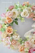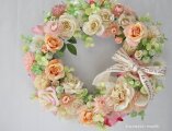 アプリコット色、ミルクティー色、ピンクとクリームの複色などの3色、2種類の表情のバラをたくさんあつめてリースに。淡いグリーンの実も2種類。そしてピンク色やクリーム色のムギワラギク、ソーラーローズなどももりこみ、やわらかな愛らしい雰囲気のリースにしました。