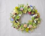 リースベース:ナチュラル素材 直径約20センチ リース素材:アーティフィシャルフラワ-(造花):ベルフラワー・アストランティア・ベロニカ・黄色の実・ピンクの小花・マム・ラベンダー・カラードリーフ・ユーカリ、など。自然素材:ムギワラギク。