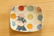 粉引きカラフルドットにミニチュアシュナウザーのスクエアケーキ皿。