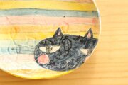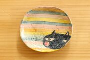 粉引きカラフルボーダーにぶさねこちゃんのオーバルケーキ皿。