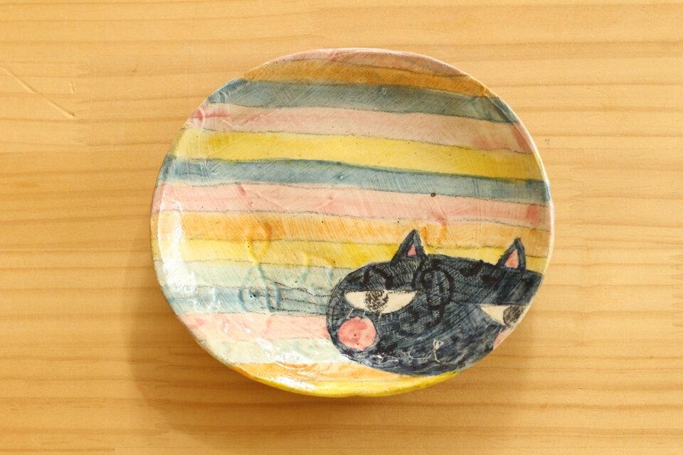 信楽の白土に白化粧を施しカラフルボーダーの中にねこちゃんを描きました。