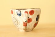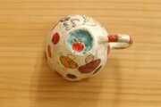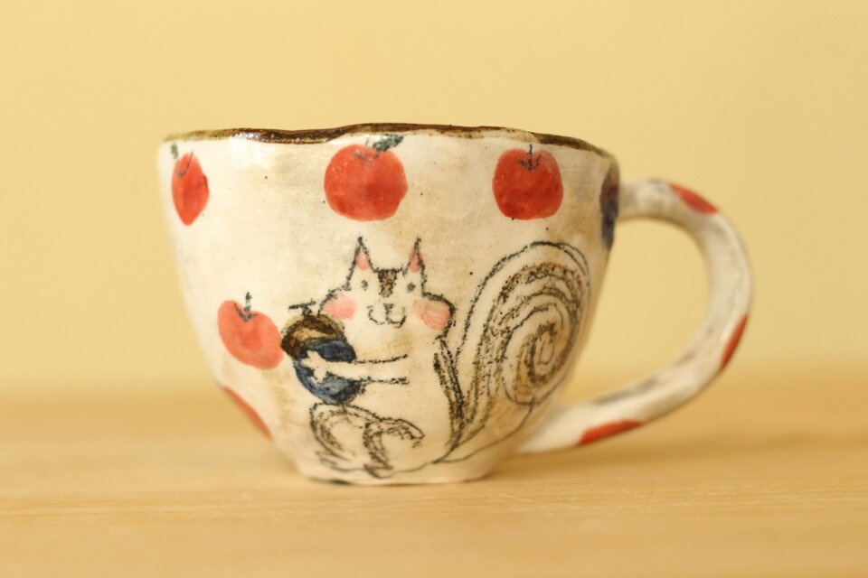 信楽の白土に手びねりでカップを成形し白化粧を施して、赤いりんごとどんぐりときのこの中にくいしんぼうのりすをを絵付けしました。