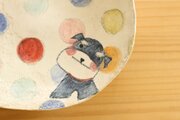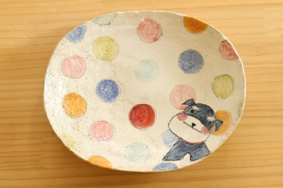 粉引きカラフルドットにミニチュアシュナウザーのオーバルパスタ皿。