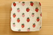 信楽の白土に白化粧を施し赤とピンクのいちごをたくさん絵付けしました。