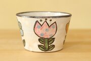 信楽の赤土に白化粧を施しカラフルにお花をぐるりと絵付けしました。