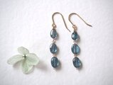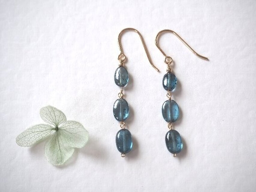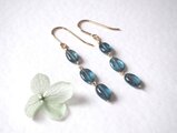 カイヤナイトといえば、深い藍色ですが、珍しいディープブルーカイヤナイトという深い青緑の小さなオーバル石を3石、連ねたピアスです。下へいくほど少しだけ石を大きくし、小さいながら、耳元に揺れるシックなピアスです。これからの季節にぴったりです。