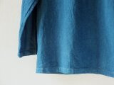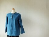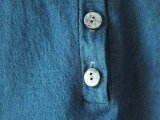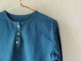 浅間山麓、標高1000メートルのところにあるわが家の畑で育てた藍で染めたクルタシャツです。生地はタイの平織り木綿、中厚手。比較的織り密度が粗いので、やわらかな質感の生地です。温かみもあり、シャツやパンツによく使っています。