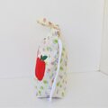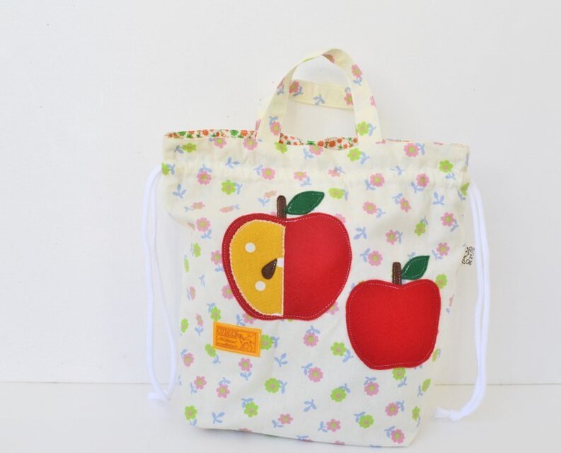 フェルト&水玉プリント生地をを組み合わせて作ったリンゴのアップリケをクリーム色小花柄生地に縫いつけています。裏地はオレンジ系小花柄生地を使用しています♪