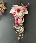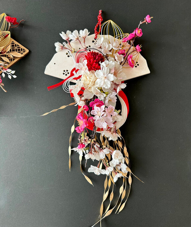 花材:アーティフィシャルフラワー桜・ウメ・マム・ベリー・リーフ・紅白水引しめ飾り・扇プレート・ドライフラワーソーラーローズ・扇など