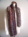 深い色合いの毛糸を組み合わせた、手編みのストールです。