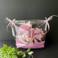 プリザーブドフラワーローズやカーネーションの華やかなバスケットアレンジ