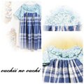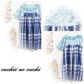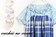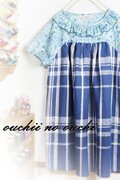 しっとりリネン ブルー&ホワイトのブロックチェックとリバティ輸入タナローンElysianエリジアンエメラルドブルー系 でお作りしましたヨーク切り替えドルマンスリーブのチュニックワンピース 巻きロックフリル仕上げです。
