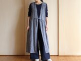 縦長の視覚効果が高いロングジレ、共布の紐を結ぶと胸元が深いVになりますので上半身がスッキリした印象に。