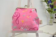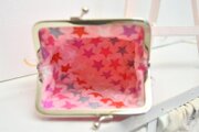 ●表地はピンク系音符柄キャンパス地にメルヘンねこちゃん柄生地を組み合わせています。裏地はピンク系星柄キルト生地でがま口はシルバーの100ミリを使用しています。