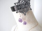 原石そのままのアメジストのラフロックを一粒のピアスに仕立てました。形も角ばった不定形な形、白と紫のほんのりグラデーションの、いかにも美しい天然石です。大きさもありますので、一粒でも十分なアクセントになります。角砂糖のような、雰囲気のある大人っぽい一粒を、アメジストのボタン石の下にぶら下げました。一つ一つ形が違う為、同じぐらいの大きさのものをペアにしています。左右の違いもまた、天然石ぽく素敵です。