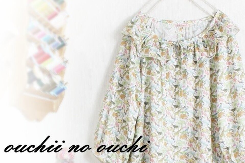秋にむけてリバティタナローン人気柄 Queue for the Zoo キュー・フォー・ザ・ズーで巻きロック仕上げのフリル襟リボンラグランロングブラウスを作りました。