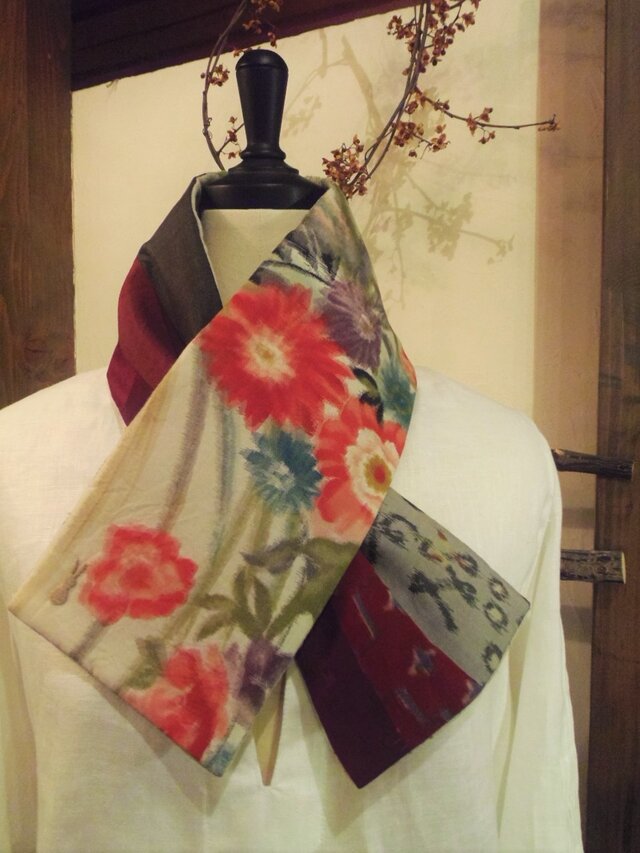 本日届きました。銘仙の柄も別珍の色味もとても素敵ですね。お手紙も以前購入した襟巻と同じ柄のプチストールもお心遣いに感謝いたします。この秋冬も3枚とも大切に使わさせていただきます。裏地の色選びの段階からからずっとワクワクし待って居りました。本当に価値のある買い物をさせていただき有難うございました。