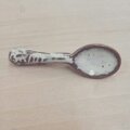 茶系の土に淡雪のような釉薬をかけた陶器のブローチです。