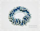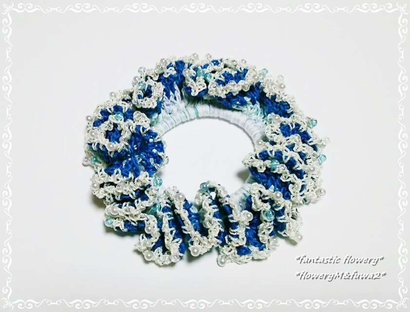 ビビットなブルーと優しいブルー系マーブルのレース糸を使い、縁はホワイトラメのレース糸でビーズを編み込みました。