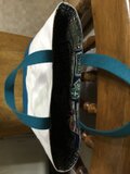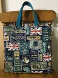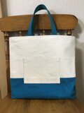 表地は、綿麻混紡のカジュアルな生地、裏側はセルリアンブルーとオフホワイトの8号帆布を使用した、自立するシンプルなトートバックです。持ち手も同じ色にしてみました!長めなので、肩から下げることができます。これからの季節荷物が多い時に重宝するサイズです。