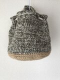 底は麻ひもで丸底、側面は白とモカの毛糸の二本取りで編みあがり、持ち手は綿ロープをくぐらせています。