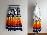 デッドストックのパネルクロスとモダンな鳥柄を組み合わせて、ゴムギャザースカートを仕立てました。