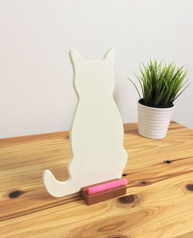 【ねこ雑貨】 白猫のチョークボード(シルエット) チョークが置けるスタンド付き