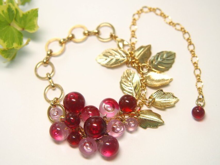 赤とピンクのつぶつぶと葉っぱのブレスレット
