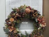 およそ20種類の秋の木の実や、グリーンで直径約25cmのミディアムサイズの木の実のWreathです。