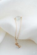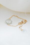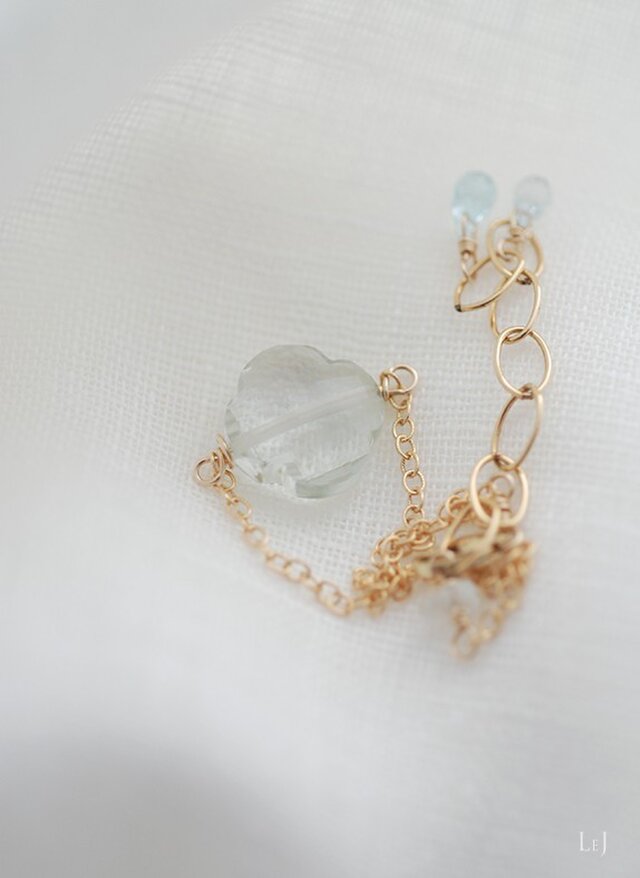 手に取るとしっとりとやさしく、ずっと眺めていたくなるような、クローバーのかたちのグリーンアメジストのすべらかさ。アジャスターの先に付けたサンタマリア・アクアマリンは、きらきらと光を放つブリオレットカット。チェーンのエンドには、ファセッテドラウンデルカットのハイクオリティ アクアマリンも付けました。