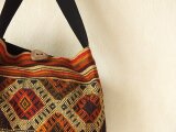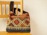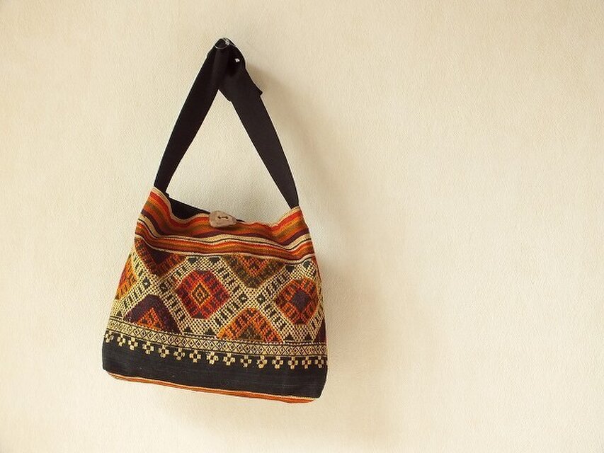 ラオスの主に北部に暮らしているタイルー族の古い織物から、かばんを作りました。この布は、ラオス北部のノンキャウという小さな町の市場で、旅の途中に手に入れました。