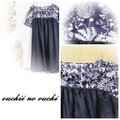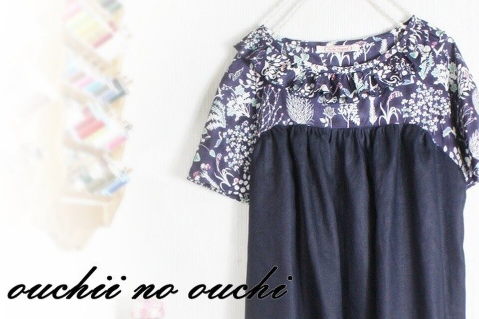 しっとりリネン100ネイビーとリバティタナローンヨシエ通常サイズネイビー系 でお作りしましたヨーク切り替えドルマンスリーブのチュニックワンピース巻きロックフリル仕上げです。