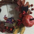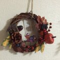 こちらはフェイクのパンプキンやどんぐりと、落ち葉のような微妙な色合いのアートフラワーのリーフを使い制作いたしました小さめリースです。