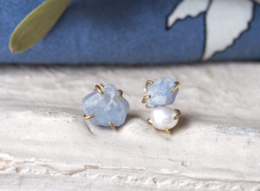 整いすぎない自然な丸みのパールと合わせ、それぞれの天然石らしい質感が響き合う、ラフでアシンメトリーなピアスです。
